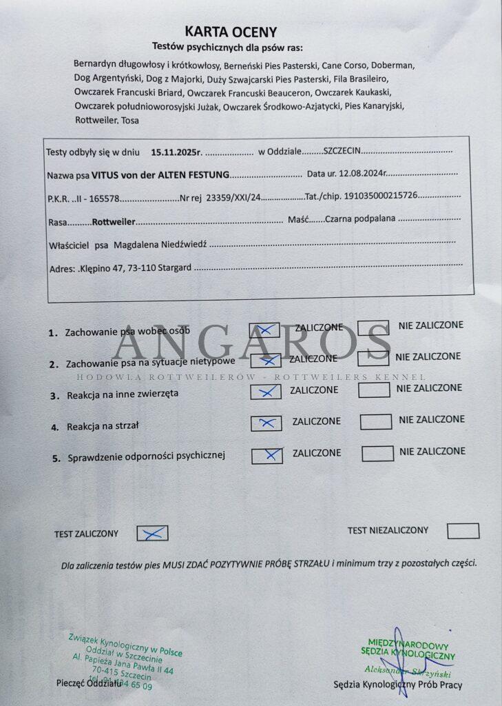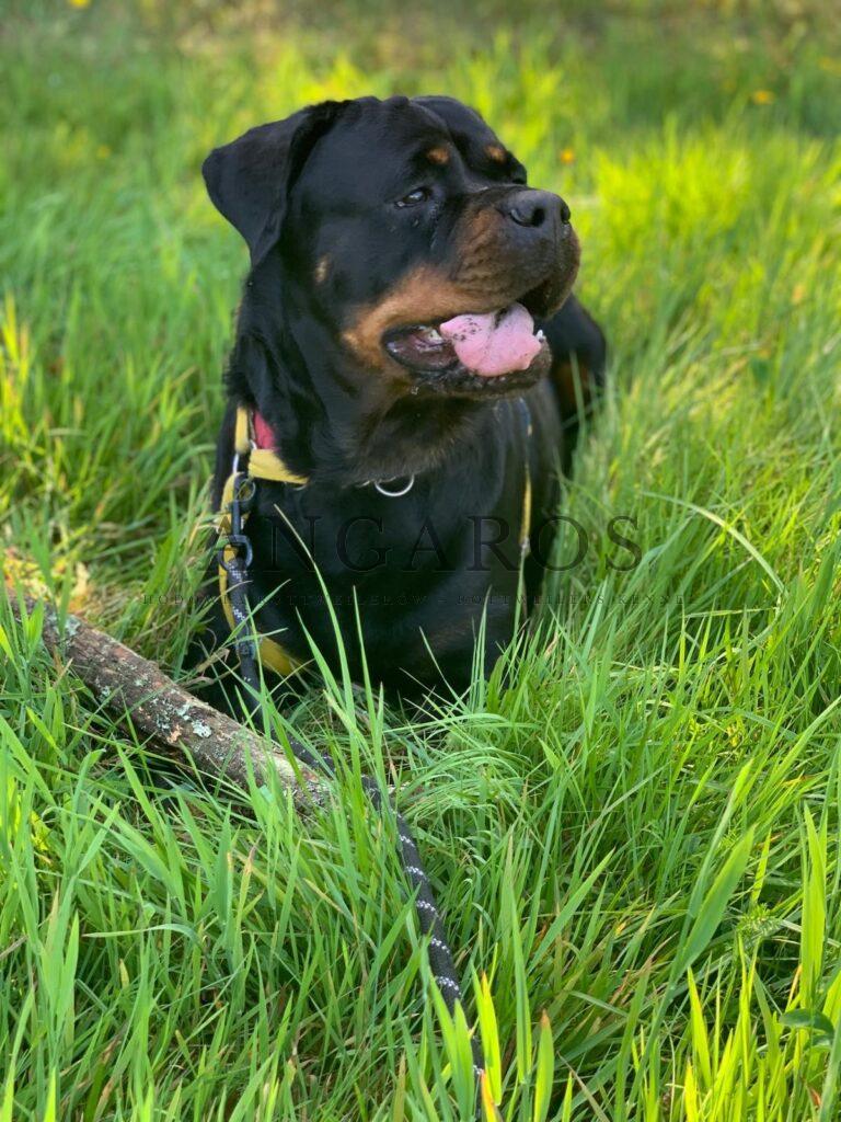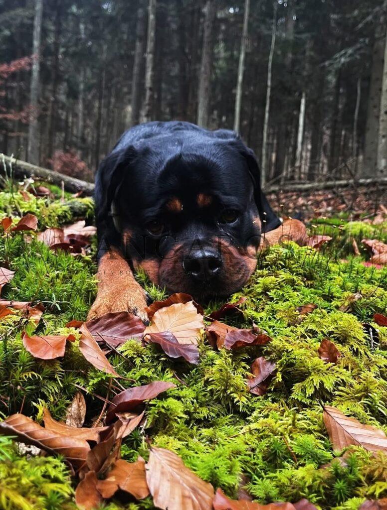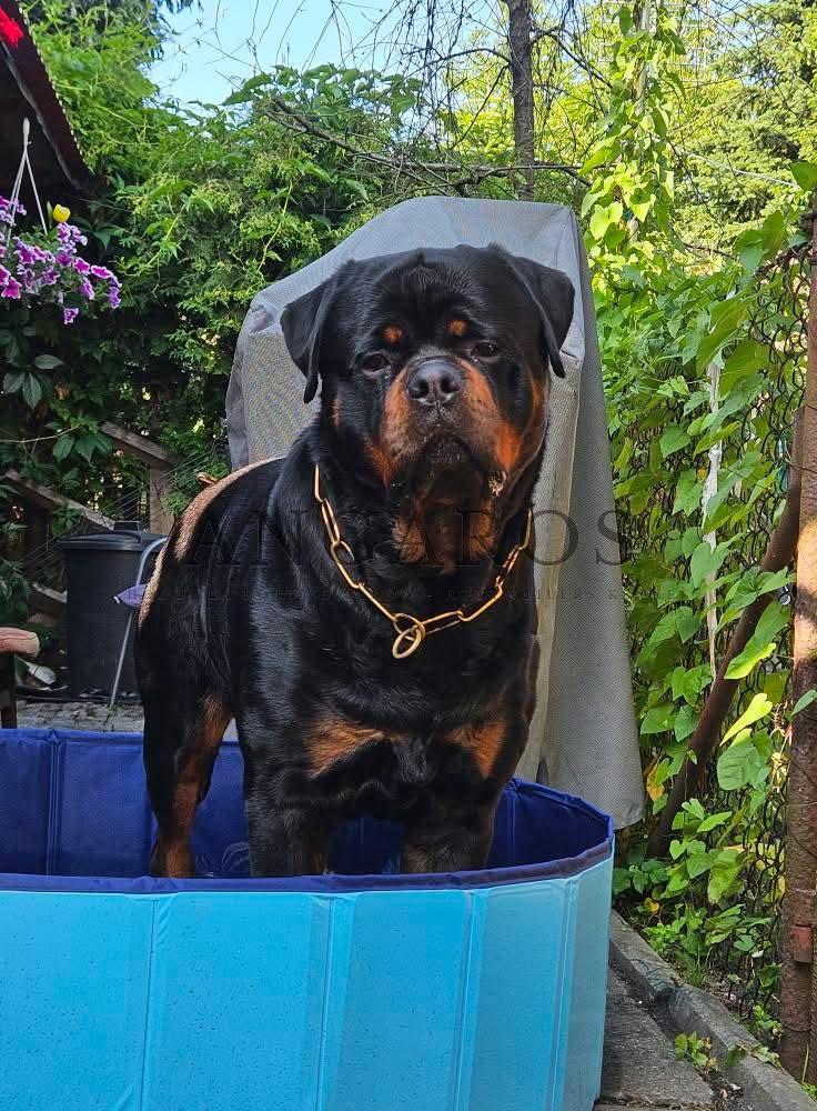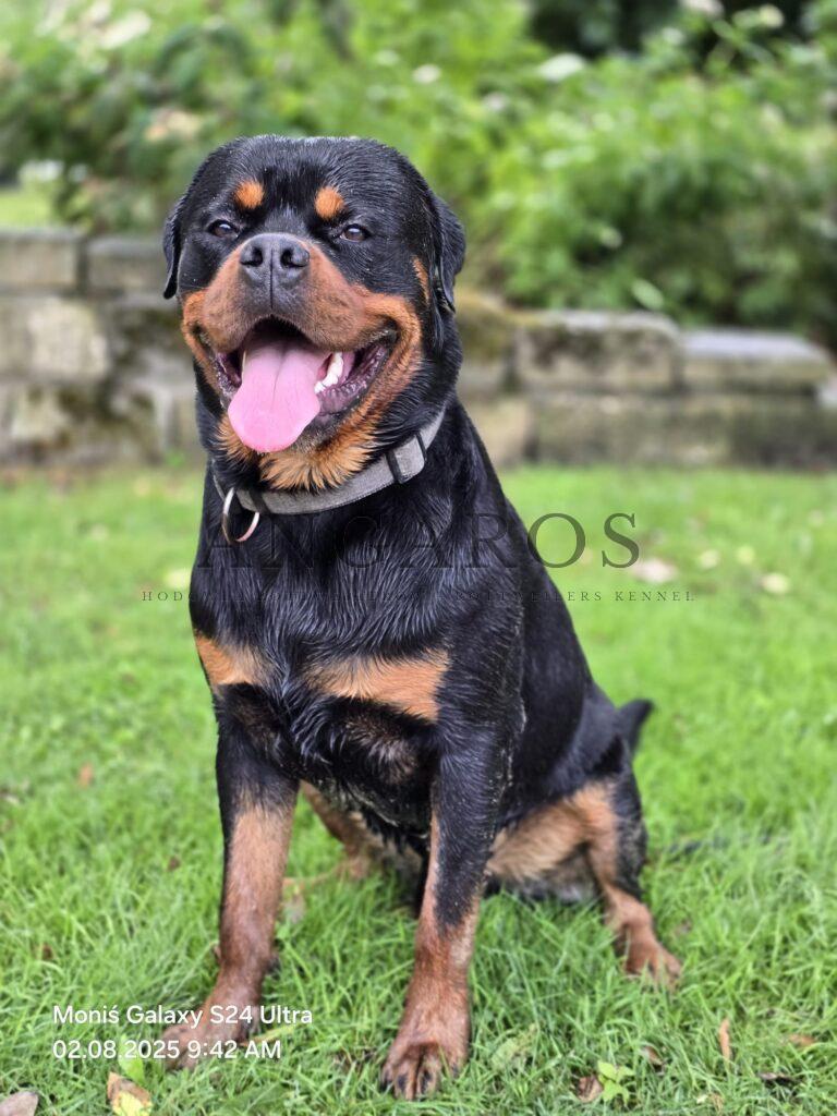 Oprócz walorów eksterierowych ma także świetny charakter i doskonały rodowód tzw. świeża krew na której bardzo nam zależało. Jest synem Zwycięzcy Świata ’24, Zwycięzcy Europy ’23. W swoim rodowodzie posiada jedne z najlepszych rottweilerów obecnych jak i ubiegłych czasów. Jest całkowicie wolny od dysplazji stawów biodrowych i łokciowych (HD – A, ED 0/0), a także JLPP N/N.