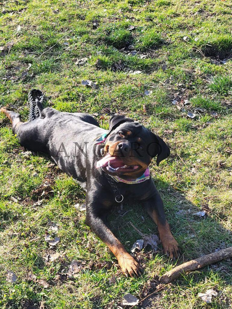 Poniżej w świetnej formie niespełna 13 letnia AIRA Angaros. Przepięknie się trzyma, bardzo przypomina mi niestety już za tęczowym mostem swoją mamę Dusię. Jest niesamowitym rottweilerem, wiele razy podróżowała na pokładzie samolotu jako tzw. „emotional support dog”. Imię AIRA (air – powietrze) też nie jest przypadkowe, jeszcze przed jej narodzinami wiedziałyśmy, że będzie w przyszłości latała samolotem. AIRA wraz ze swoją rodziną mieszka w USA.